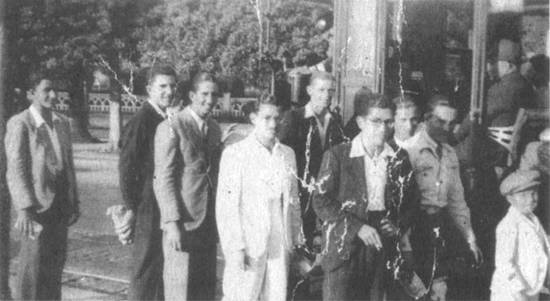 Esta foto foi feita na Praça Independência, esquina com a Rua Galeão Carvalhal, em Santos. Mostra o time de futebol "Trinca do Veneno". A imagem é de 1942 e pertence ao acervo de João Gomes Gimenes:
