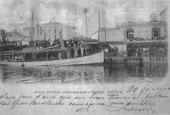 com destino à Estância Balneária do Guarujá, embarcavam em lanchas a vapor, no Valongo,
