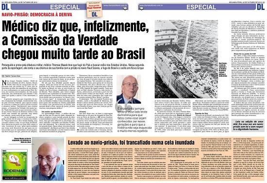 Série de matérias publicadas no jornal santista Diário do Litoral, relembrando a história do navio-prisão e provocando para que o tema seja debatido na Comissão da Verdade instituída neste ano para a apuração dos fatos relativos ao regime militar implantado no Brasil a partir de 1964. Esta matéria foi publicada na edição de segunda-feira, 22 de outubro de 2012, páginas 8 e 9: