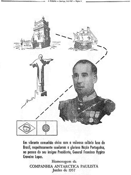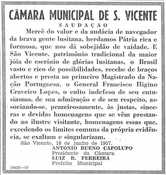 Em visita às principais cidades brasileiras com significativas comunidades portuguesas, em 1957, o presidente Craveiro Lopes, de Portugal, também esteve em Santos, onde foi festivamente recebido. No dia seguinte, o jornal santista A Tribuna publicou, em 18 de junho de 1957, uma terça-feira  (exemplar no acervo de António Mendes, de Praia Grande/SP - ortografia atualizada nesta transcrição) -continuação: