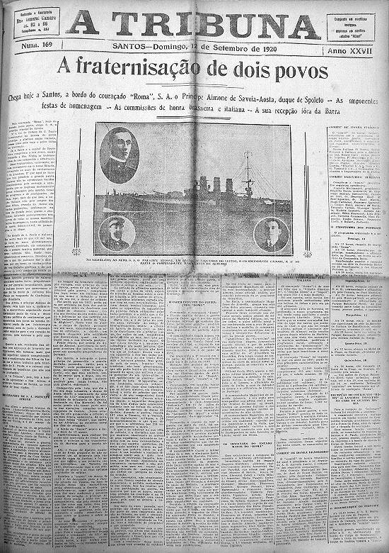 Imagem: reprodução da primeira página do jornal santista A Tribuna, em 12/9/1920