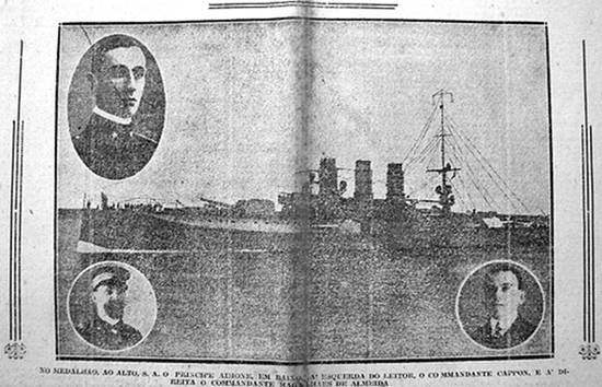 No medalhão, ao alto, s. a. o príncipe Aimone, em baixo à esquerda do leitor, o comandante Capon, e à direita o comandante Magalhães de Almeida