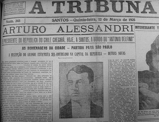 O noticiário publicado na primeira página do jornal santista A Tribuna, numa quinta-feira, 12 de março de 1925, destaca a passagem por Santos na volta de Arturo ao Chile, para completar seu primeiro período como presidente daquele país (ortografia atualizada nesta transcrição):