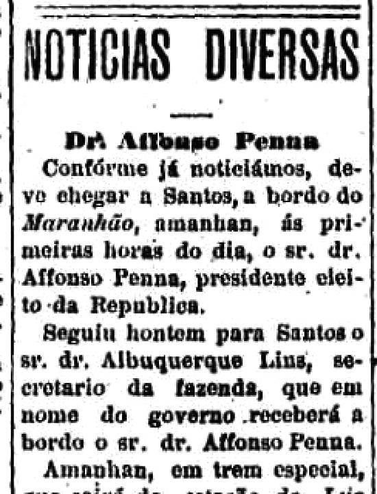 Santos, a bordo do Maranhão, embarcando ontem mesmo para esta capital, o sr. dr. Affonso Penna, vice-presidente da República e presidente