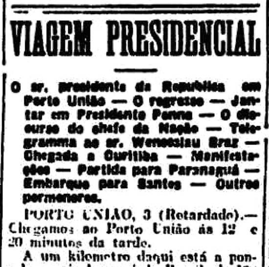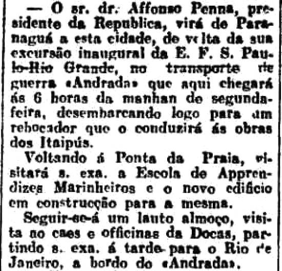 Daí o sr. dr. Affonso Penna seguirá em visita aos Estados do Paraná e Santa Catarina, desistindo de fazer por