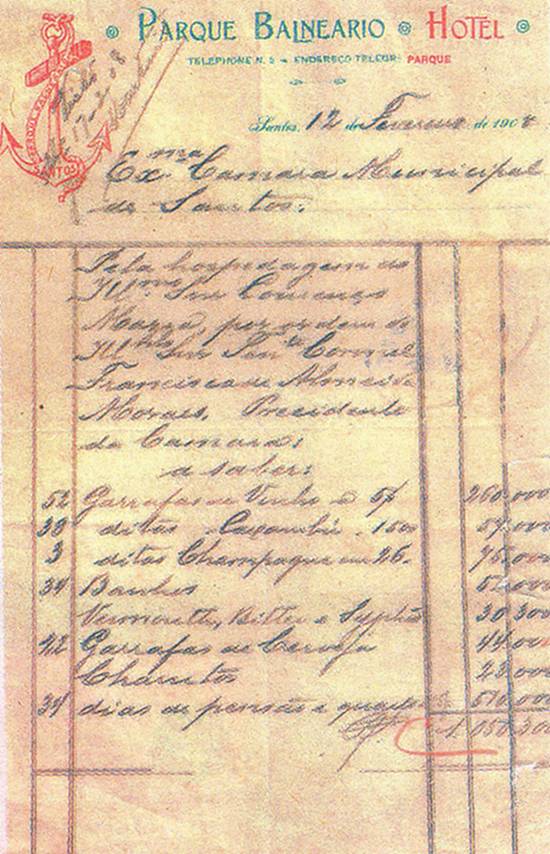 ILUSTRE - Nota fiscal do ainda modesto Parque Balneário Hotel, de 1908, quando era gerido por