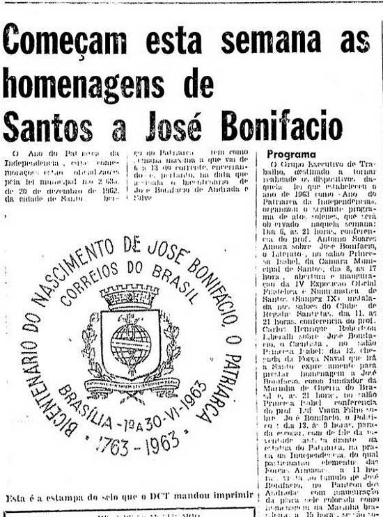 Em 4 de junho de 1963, o jornal paulistano Folha de São Paulo noticiou em sua página 8 o lançamento pelos Correios de um selo em homenagem ao bicentenário do nascimento de José Bonifácio, como parte dos festejos do Ano do Patriarca da Independência - oficializados pela lei municipal santista nº 2.635, de 20/12/1962:
