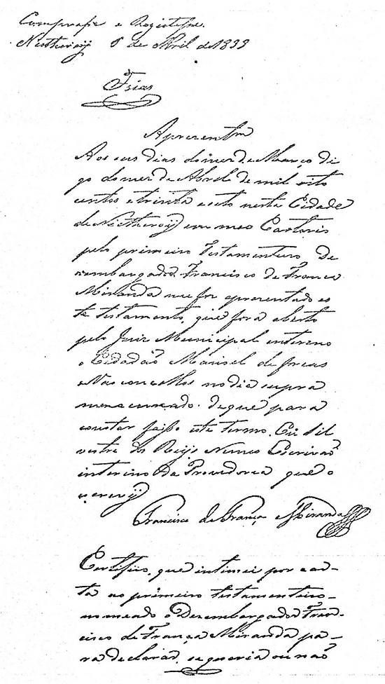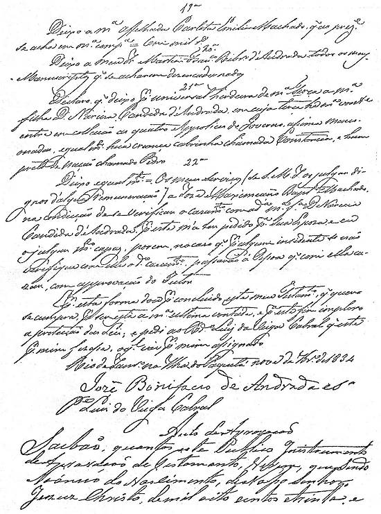 está o seu testamento, feito na ilha de Paquetá, no Rio de Janeiro, até 8 de abril de 1838:
