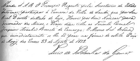 dado e assinado no Paço de Mogy das Cruzes, pelo príncipe-regente que vinha do Rio a S. Paulo, em excursão de caráter essencialmente político.
