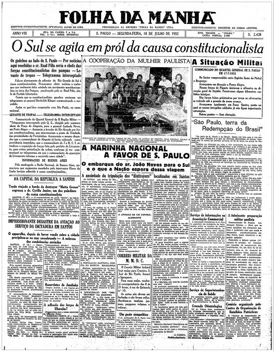 Reprodução parcial da primeira página da edição de 18/7/1932 do jornal Folha da Manhã