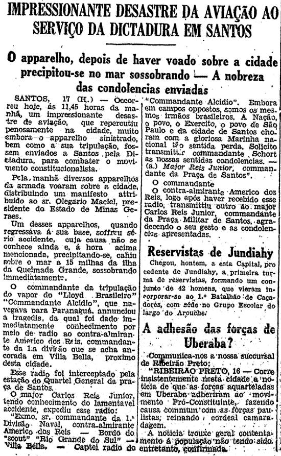 que repercutiu penosamente na cidade, muito embora o aparelho sinistrado, bem como a sua tripulação, fossem enviados a Santos pela Ditadura, para