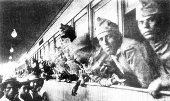 Imagem de soldados paulistas embarcando na Estação da Luz, na capital,