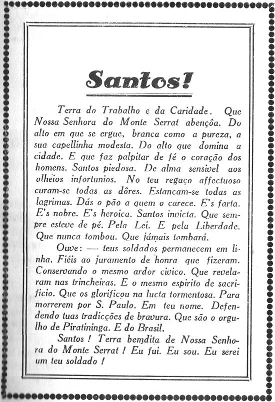 santista fosse a primeira de S. Paulo a dar o luminoso exemplo de enviar voluntários para as linhas de frente. E conseguiu isso. Dentro da modéstia