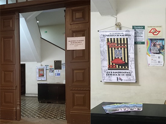 Detalhe do banner Santistas nas Barrancas do Paranapanema no saguão de entrada da Estação Ferroviária do Valongo, sede da Secretaria de Turismo, Comércio e Empreendedorismo de Santos Fotos: Ana Carolina Tani Kader
