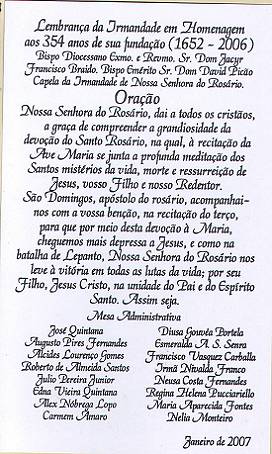 "Santinho" de Nossa Senhora do Rosário (frente e verso), emitido em janeiro de 2007