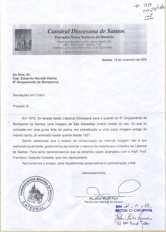 Carta assinada em 18 de novembro de 2005 pelo pároco da Catedral, padre José Myalil Paul, solicitando o retorno àquela igreja da imagem de São Sebastião que estava na gruta do Corpo de Bombeiros