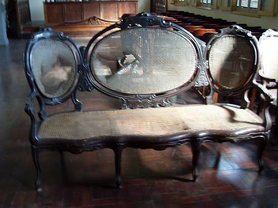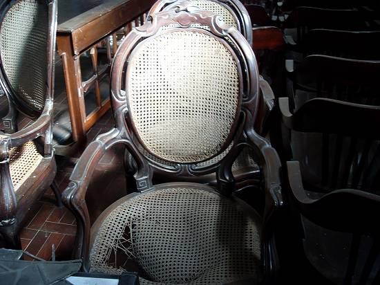 Materiais depositados no piso superior da igreja: cadeiras de madeira com tela