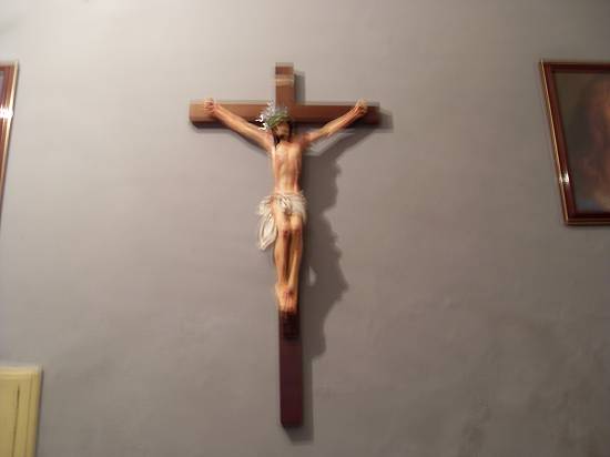 Depósito de mobiliário antigo e danificado, no piso superior da igreja: crucifixo