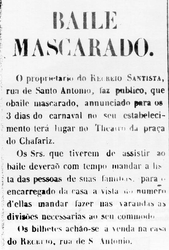 Anúncio de um baile de máscaras, publicado em 1851 na Revista Comercial, em