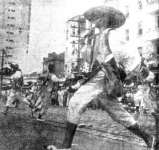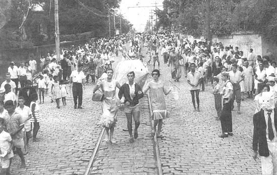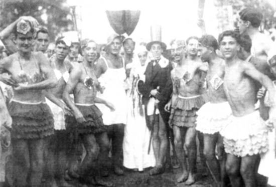 Grupo travestido "Baianas sem Tabuleiro" desfilando pela Rua Marquês de São Vicente em 1938