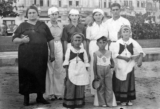 Crianças e jovens fantasiados, na praia do Gonzaga, em 1935/1940. A avó do remetente da imagem, na foto, é que confeccionava as fantasias dos filhos (exceto o rapaz à direita)