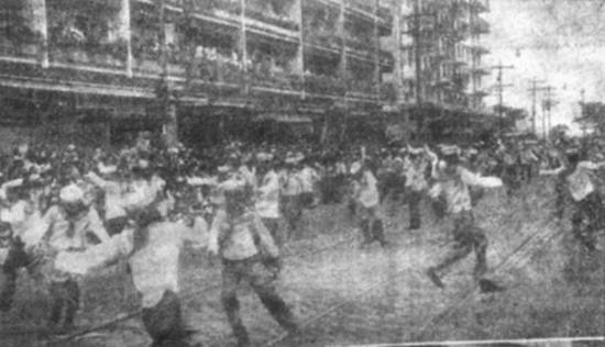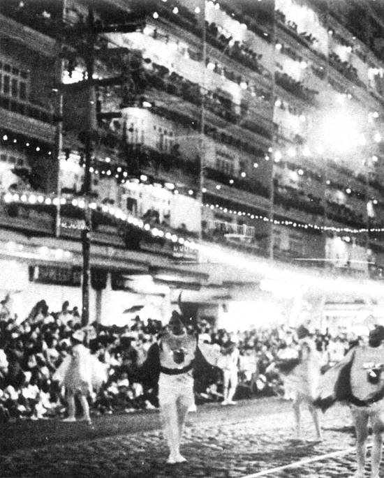 Desfile do bloco Baianas sem Tabuleiro, no carnaval de 1959, quando os foliões desciam a Rua Frei Gaspar, rumo à Praia do Gonzaguinha, em São Vicente