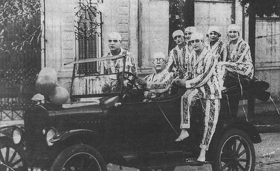 Foto feita no carnaval de 1925, defronte ao Cassino Recreio Miramar (que funcionou de 1896 a 1940 no final da Avenida Conselheiro Nébias), vendo-se ainda, ao lado, o portão da chácara de Júlio Conceição. Quem dirigia o carro era o desembargador Fonseca, acompanhado por Domingos Bruno, esposa e cunhados