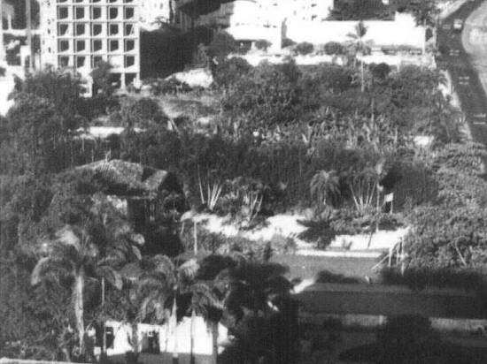 Detalhes do Parque Indígena, em reprodução de uma foto de fins da década de 1940, integrante do mini-álbum semi-artesanal de fotos "Panoramas de Santos (Brazil)". Á direita na imagem, vislumbra-se parte da avenida praiana