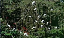 A abundância da vegetação atrai inúmeros pássaros, que vivem em liberdade entre animais