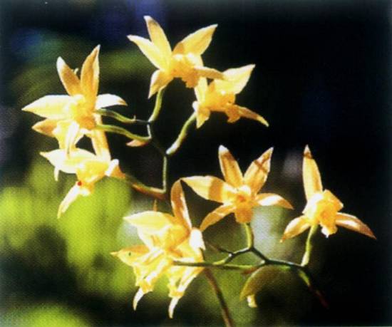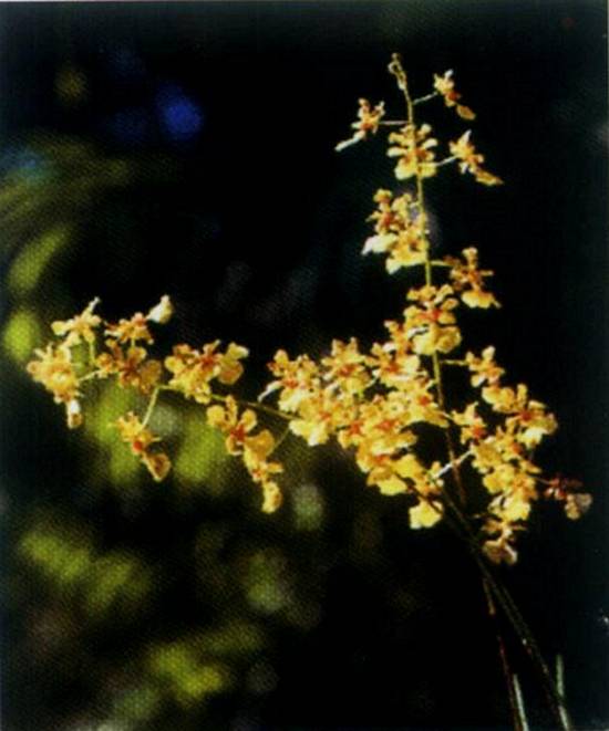 Chuva-de-ouro (Oncidium cebolleta) - Orquídea com distribuição natural estendendo-se do México ao Paraguai e comum no Nordeste brasileiro. Suas folhas apresentam aspecto peculiar do tipo "cauda de rato", arredondadas. As pequenas e numerosas flores amarelas encontram-se agrupadas em hastes florais e aparecem no outono