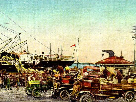 Porto de Santos em 1908: veículos motorizados começavam a substituir as carroças,