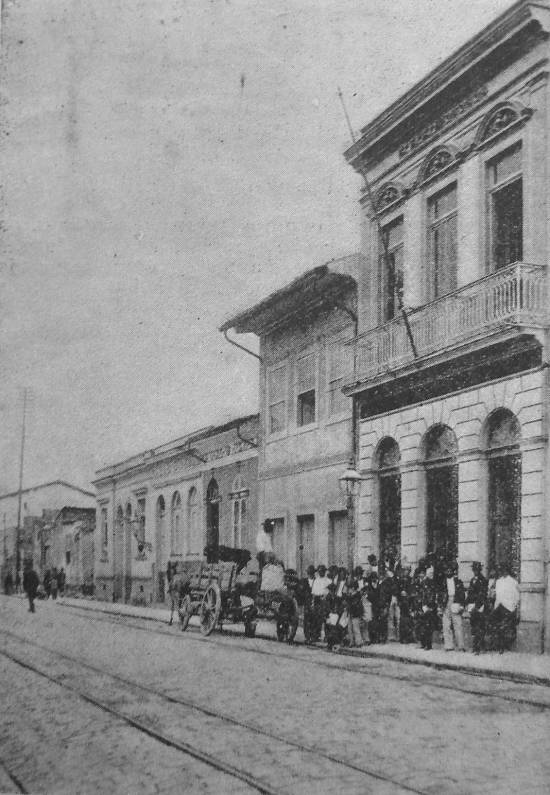 Instalações temporárias da Agência do Correio de Santos, em 1902. Em 1887, essa agência estava instalada em dependências exteriores do Convento do Carmo