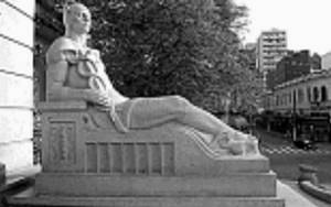 Escultura de Mercúrio, deus do comércio da mitologia greco-latina, na entrada do