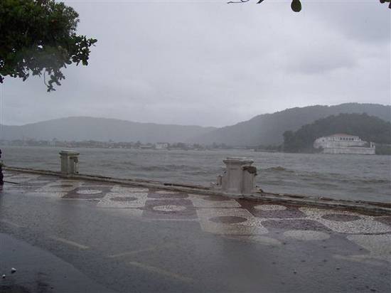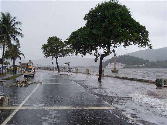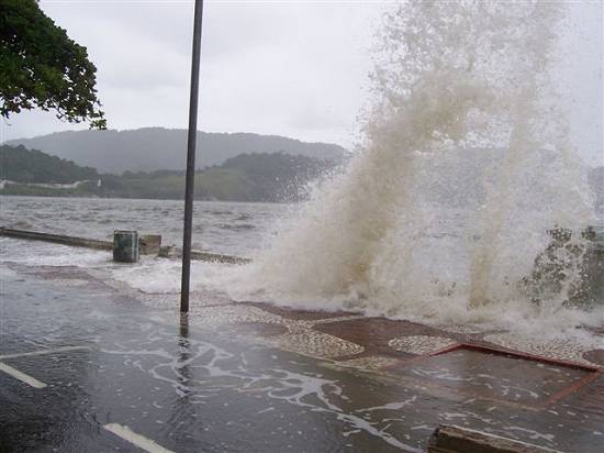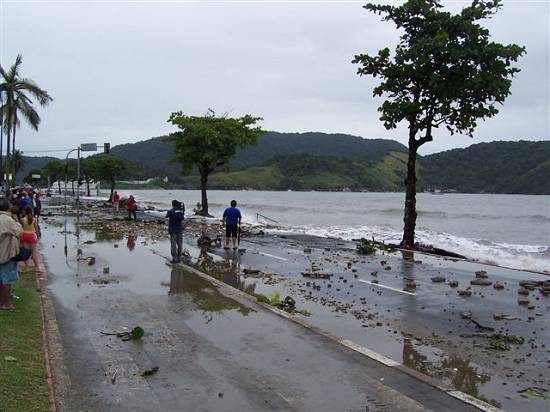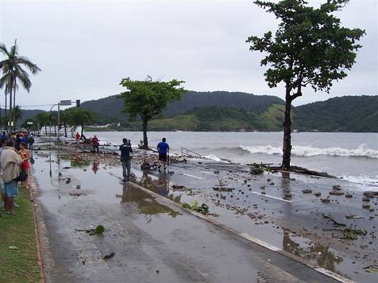 Após a forte ressaca registrada em 26 de abril de 2005, estas imagens de autor não identificado começaram a circular em listas de mensagens pela Internet, mostrando o trecho da avenida litorânea danificado pelas ondas na Ponta da Praia, em Santos:
