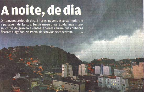 horas de ontem quando, de repente, o céu de Santos começou a escurecer. Logo depois, muita chuva, raios, trovões e ventos fortes pegaram a população