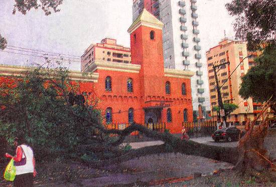 em várias partes de Santos, como na Praça de Nossa Senhora Aparecida, onde uma árvore tombou próximo à igreja