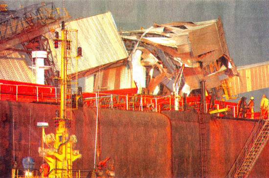 navios atracados e a queda de um guindaste para operação de contêineres. Houve, ainda, o desabamento da cobertura de uma das entradas para o
