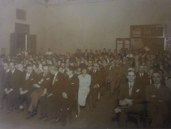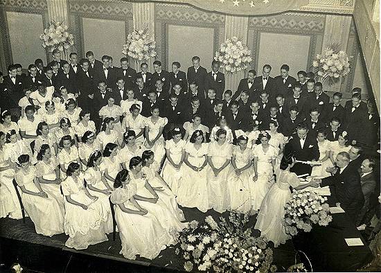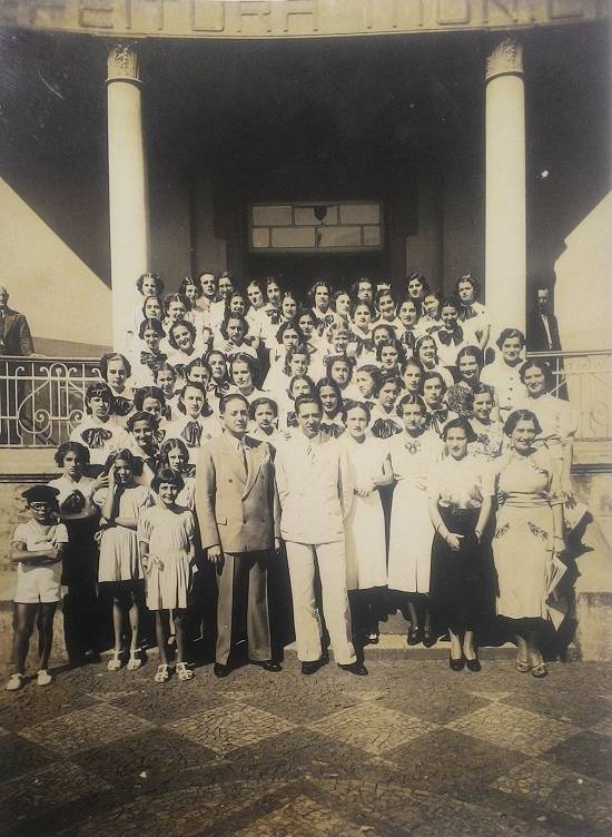 Formatura de alunas de 1941 da escola Dona Escolástica Rosa, no salão da Sociedade Humanitária dos Empregados no Comércio (SHEC), com a participação do prefeito municipal Antônio Gomide)