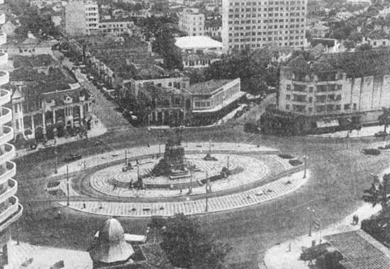 O monumento aos Andradas, antes destaque na Praça da Independência, agora abafado pelas sombras de imponentes construções