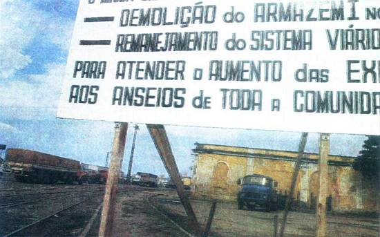 Um dos dizeres é o seguinte: "Demolição do Armazém 1 e remanejamento do sistema viário