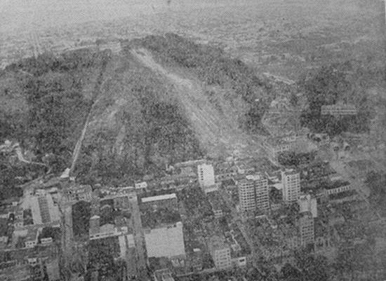 alguns segundos os moradores daquele bairro ouviram o sinistro ruído da massa de lama e pedra, que rolava pela escarpa do morro. Depois, a chuva