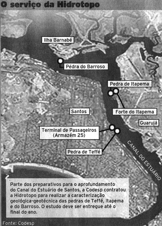 De acordo com o superintendente de Atracação e Serviços da Codesp, Pedro Mauro Lopes, os estudos sobre as três pedras - Teffé, Itapema e Barroso - têm a finalidade de identificar suas características, como tamanho e consistência. Os levantamentos vão complementar o Estudo de Impacto Ambiental e o Relatório de Impacto no Meio-Ambiente (EIA-Rima), necessários para a obtenção das licenças ambientais para a dragagem de aprofundamento do estuário.