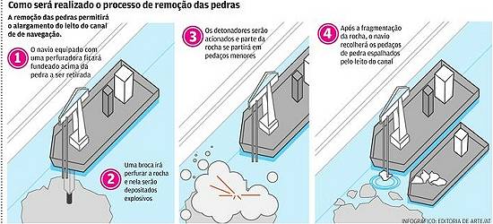 Como será realizado o processo de remoção das pedras - a remoção das pedras permitirá o alargamento do leito do canal de navegação: 1) O navio equipado com uma perfuradora ficará fundeado acima da pedra a ser retirada; 2) Uma broca irá perfurar a rocha e nela serão depositados explosivos; 3) Os detonadores serão acionados e parte da rocha se partirá em pedaços menores; 4) Após a fragmentação da rocha, o navio recolherá os pedaços de pedra espalhados pelo leito do canal