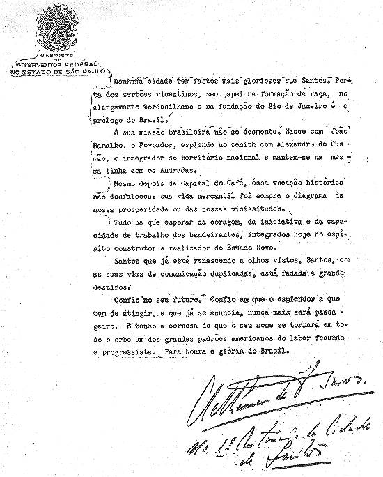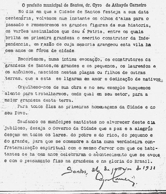 Mensagem do prefeito de Santos, Cyro de Athaíde Carneiro