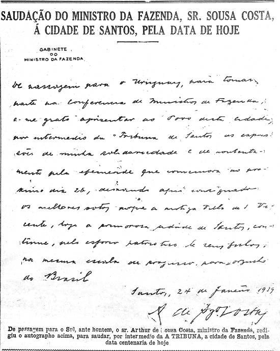 Mensagem do ministro da Fazenda da República, Arthur de Souza Costa