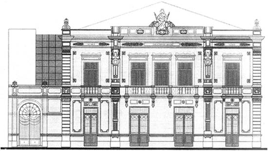 Proposta da Prodesan para a fachada do Guarany. As paredes serão pintadas em amarelo-imperial. Portas e janelas serão de madeira. No telhado, a imagem da Musa das Artes e, logo abaixo, a inscrição: Theatro Guarany