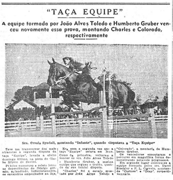 Na foto: Sra. Úrsula Syndall, montando "Infante", quando disputava a "Taça Equipe"