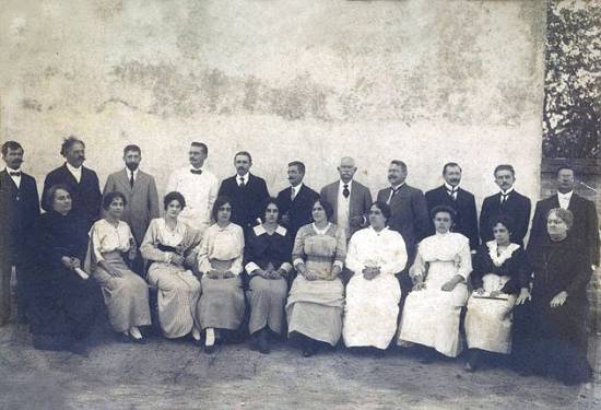 Em foto do início do século 20, a primeira congregação do Liceu Feminino Santista. Na primeira fila: Soter de Araújo, Adelaide Britto, Eunice Caldas, Vitalina Caiafa e Porchat de Assis.