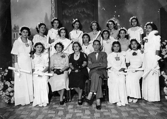 Formandas de 1937 da Escola de Corte e Costura São Paulo. A primeira pessoa sentada, à esquerda, é