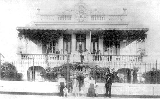sua família reunida em 1908, época em que a avenida ainda não tinha pavimentação. A casa não existe mais. Hoje o local abriga a sede municipal do